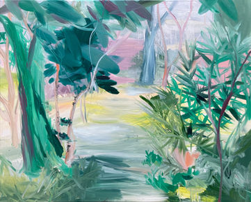 Ainsi la peinture s'est toujours présentée à moi comme une évidence. La diversité de son language, ses résonnances en terme de couleurs m'ont toujours fait pressentir des correspondances avec l'énergie du lieu dans lequel je peins: la nature. Les mousses, les arbres, le bois, le vent sont des éléments avec lesquels je travaille. Je réalise une installation au-dessus de ma toile à l'aide de feuillages sélectionnés pour capter les ombres portées, à la recherche d'un détail pour amener un élément figuratif dans mon fond abstrait. Les formes organiques dansent alors comme des ombres empreintes de douceur et de volupté. Mes toiles répondent aux mouvements des flux, et décrivent une atmosphère vaporeuse. La lumière du soleil est pour moi essentielle, c’est elle qui détermine le contour d’une ombre portée qui établit la relation entre celle-ci et l’environnement chromatique et sensoriel de la composition.